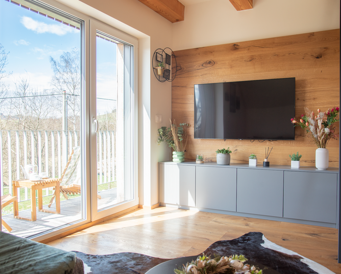 Cozy living in a 3-bedroom style , ideal for larger families or groups. It offers a spacious living room connected to the kitchen, bedroom, separate bathroom, sofa bed in the living room, balcony and attic space with a double and single bed. This ensures enough space for rest, relaxation and a comfortable stay for the whole family or group . A great advantage is the shared garden with the possibility of barbecue and children's activities on the playground .